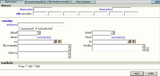 ป้อนช่วงเวลา ที่ต้องการค้นหา ตามช่วงวันที่ที่ระบุ แต่การค้นหาด้วยเวลาต้องเลือกช่วงเวลาทีระบบกำหนดให้ เฉพาะหัวข้อ ลงรับ/สร้างวันที่ หรือ ส่งออกวันที่ |