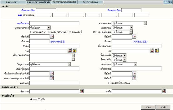 กำหนด เงื่อนไข ที่ใช้ในการค้นหา โดยเลือกระหว่าง และ ,หรือ ที่ปรากฏ กรณีที่ไม่เลือกระบบจะกำหนดให้เป็นการค้นหาเงื่อนไขแบบ และ หลังจากป้อนข้อมูลที่ต้องการค้นหาแล้ว ผู้ใช้กดปุ่ม ตกลง เพื่อสั่งการให้ระบบเริ่มค้นหา ซึ่งถ้ามีข้อมูลเข้าตามข้อกำหนดที่ค้นหา ระบบจะแสดงรายการที่พบให้ทราบ